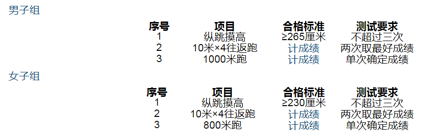 3.体能测试共设3个项目,分别为纵跳摸高、10米×4往返跑、1000米跑(女800米跑)。纵跳摸高实行达标测试,不计入体能测试成绩;10米×4往返跑和1000米跑(女800米跑)成绩记入考试总成绩。纵跳摸高未达标者不可进入下一体能测试环节和面试环节。纵跳摸高测评次数不超过3次;10米×4往返跑测评次数为2次(取最高成绩记入)、1000米跑(女800米跑)测评次数为1次。